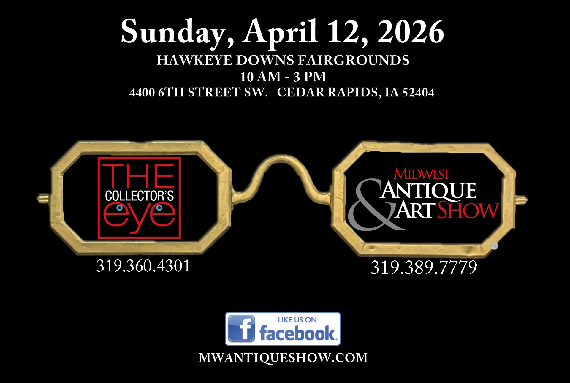 The show is located at Hawkeye Downs Exhibition Center, 4400 6th St SW, Cedar Rapids, IA. There is ample free parking and the $10 admission fee allows access to both The Midwest Antique & Art Show and The Collector’s Eye Show. Show hours are from 10am until 3pm. Nearby hotels are listed on our website at www.MWantiqueshow.com. For information on the Midwest Show call Cathy at (319) 389-7779 and for The Collector’s Eye Show, call Colleen at (319) 360-4301.